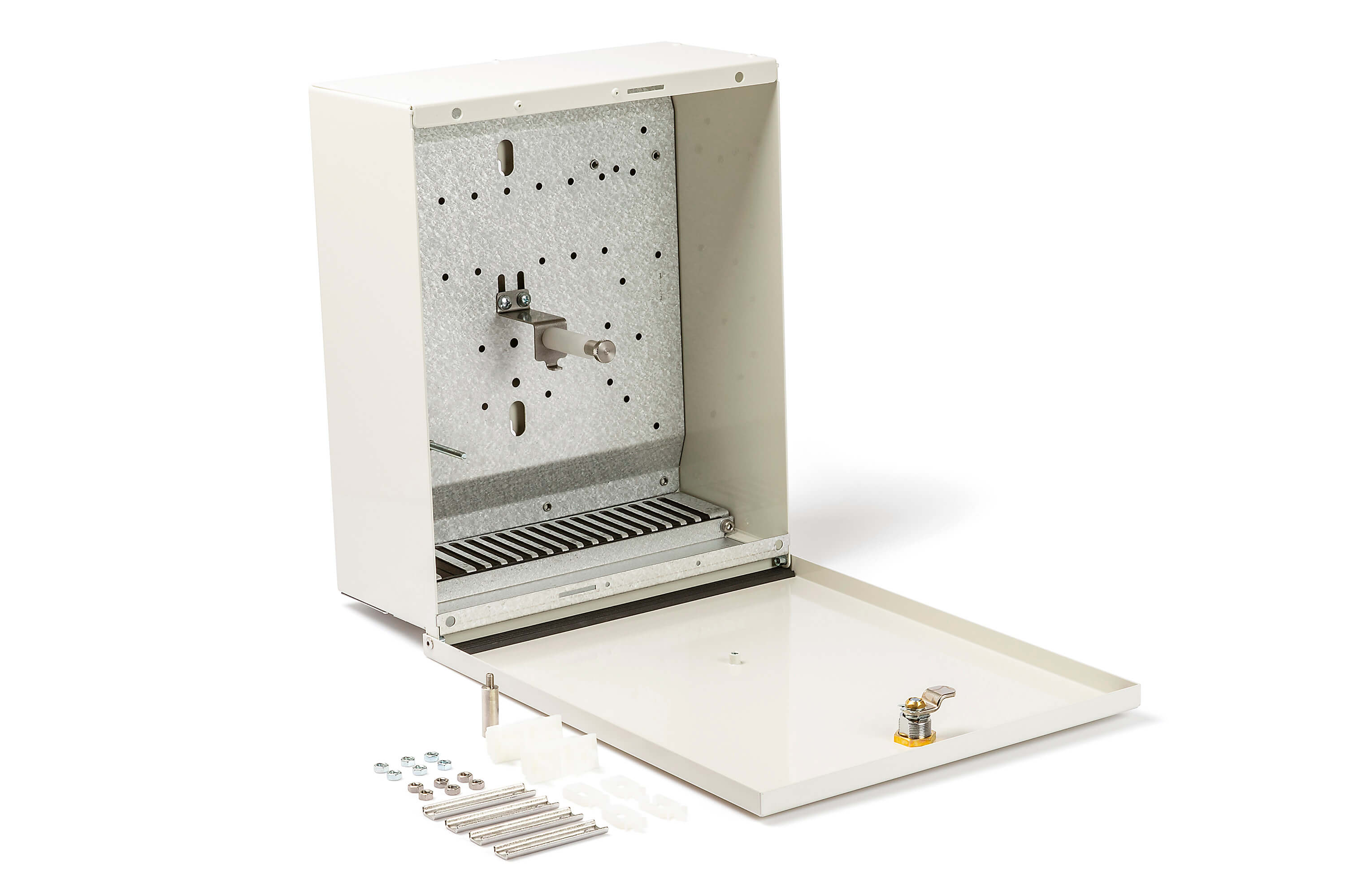 The cabinet is equiped with a lid which can be locked with a standard key lock.